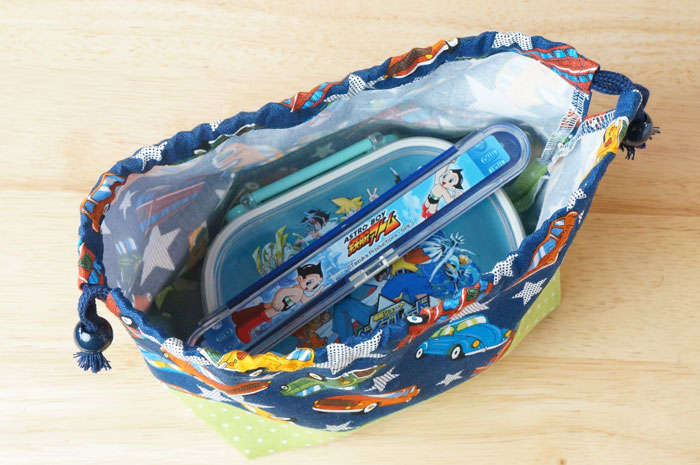 紐を両側から絞るタイプか、片側から絞るタイプかお選びください。持ち手は袋口中心にアクリルテープ25ミリ幅をお付けします!