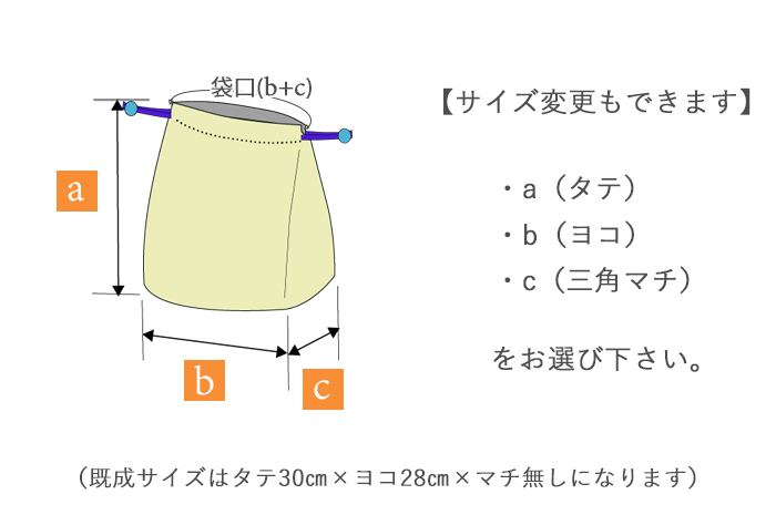 紐を両側から絞るタイプか、片側から絞るタイプかお選びください。持ち手は袋口中心にアクリルテープ25ミリ幅をお付けします!