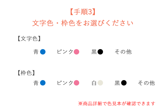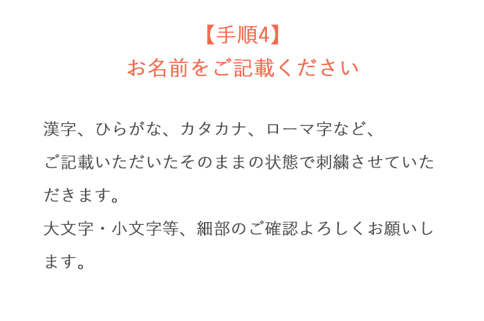 書体やカラーなどについての詳細は「刺繍文字・色見本」のページをご参照ください。