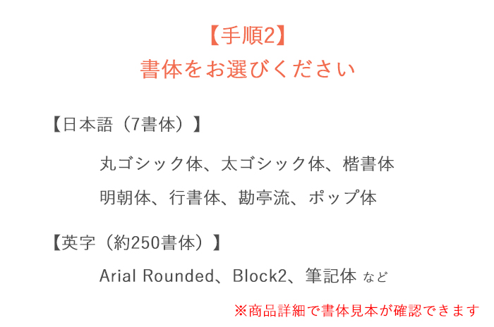書体やカラーなどについての詳細は「刺繍文字・色見本」のページをご参照ください。