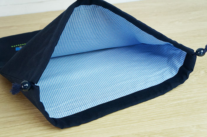 巾着紐を長くして袋下に結び、ランドセルの上などから背負えるタイプ(リュックサック型)にします