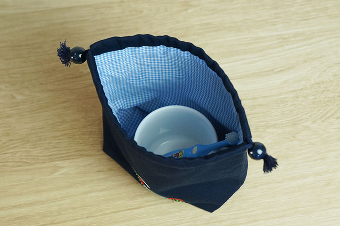 紐を両側から絞るタイプか、片側から絞るタイプかお選びください。持ち手は袋口中心にアクリルテープ25ミリ幅をお付けします!