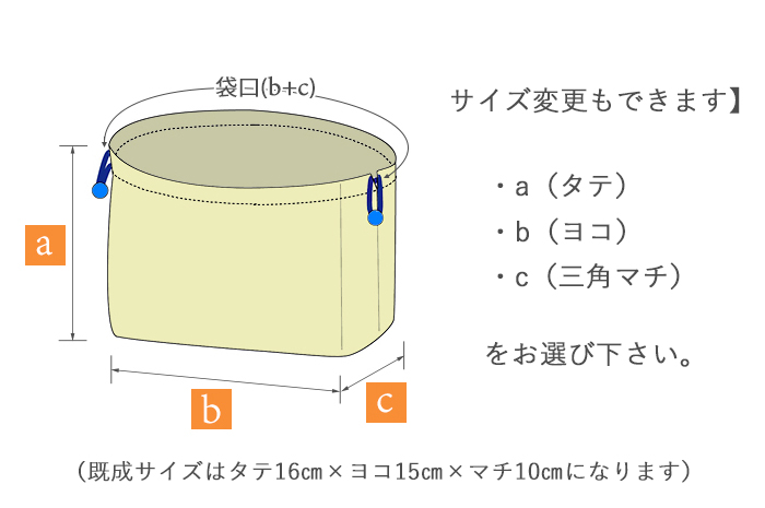 紐を両側から絞るタイプか、片側から絞るタイプかお選びください。持ち手は袋口中心にアクリルテープ25ミリ幅をお付けします!