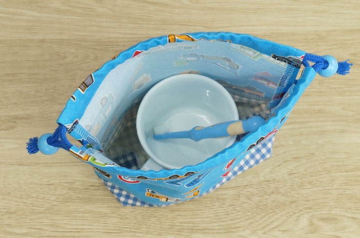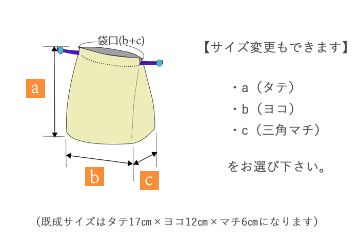 紐を両側から絞るタイプか、片側から絞るタイプかお選びください。持ち手は袋口中心にアクリルテープ25ミリ幅をお付けします!