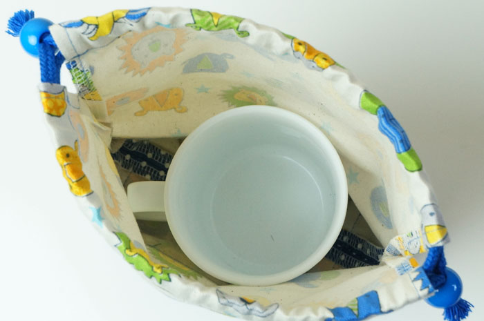 紐を両側から絞るタイプか、片側から絞るタイプかお選びください。持ち手は袋口中心にアクリルテープ25ミリ幅をお付けします!